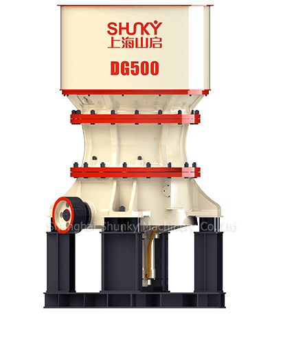 DG series single-cylinder hydraulic cone crusher has a combination of crushing machinery, hydraulic, electrical, automation and intelligent control technology. The machine is the high efficient crusher which represents advanced systematic crusher technology researched and developed independently. widely used in metal and non-metallic minerals, cement, sand, metallurgy and other industries of medium, fine and ultra-fine crushing operations. It has the advantages of high crushing efficiency, low production cost, convenient maintenance and adjustment, excellent grain type of broken products and so on. DG series single cylinder hydraulic cone crusher is composed of upper frame, middle frame, lower frame, moving cone, eccentric sleeve, transmission part, hydraulic cylinder part and so on. The horizontal shaft rotates by the motor, the horizontal shaft rotates the eccentric sleeve through the spiral bevel gear meshing, and then the eccentric sleeve drives the moving cone to make the rotation swing, thus realizing the continuous extrusion crushing.