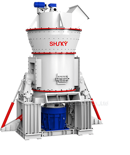 The main motor drives the grinding plate to rotate through the reducer. At the same time, hot air enters the vertical mill from the air inlet. The materials fall in the center of the grinding plate through the feed inlet. Under the action of centrifugal force, the materials move evenly from the center of the grinding plate to the edge. When passing through the grinding roller table area on the grinding plate, they are rolled by the grinding roller and large materials are crushed directly, Fine materials are extruded to form a material bed for inter particle crushing. The crushed materials continue to move to the edge of the grinding plate until they are taken away by the strong air flow at the air ring. Among the materials taken up by the air flow, the larger granular materials fall onto the grinding plate again under the action of their own gravity and continue to be crushed. The other materials enter the high-efficiency dynamic separator with the air flow for powder classification. Under the action of the blades of the high-efficiency dynamic separator, The materials that do not meet the fineness requirements return to the grinding plate for grinding, and the materials that meet the fineness requirements flow through the pipeline with the gas to enter the pulse dust collector for collection, and the finished powder is discharged through the discharge device. When the iron block and other difficult grinding sundries mixed with materials in the main machine move to the edge of the grinding plate with the materials, they cannot be blown up by the wind due to their large weight, fall into the lower cavity of the mill, and are scraped into the slag discharge port by the scraper installed at the bottom of the grinding plate, and then discharged out of the main machine.
